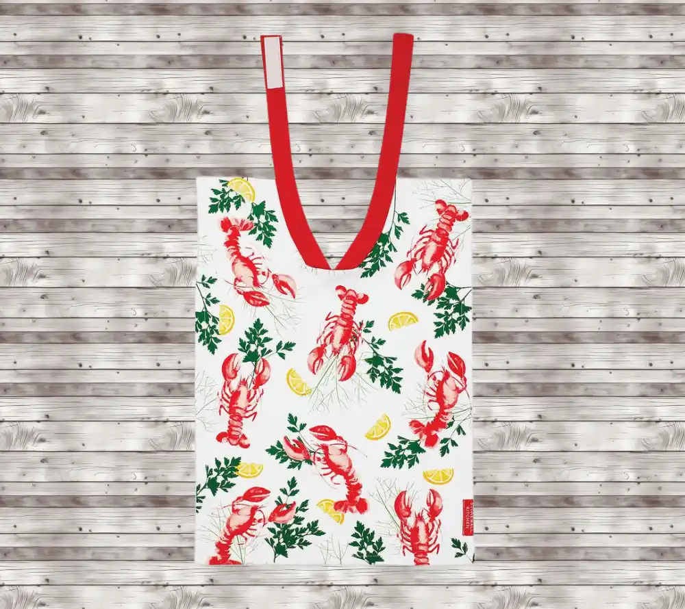 This hard to find lobster bib from Stonewall Kitchen is crafted from soft cotton and showcases a charming design featuring all the classic lobster bake essentials. A perfect lobster dining accessory no matter the season!
